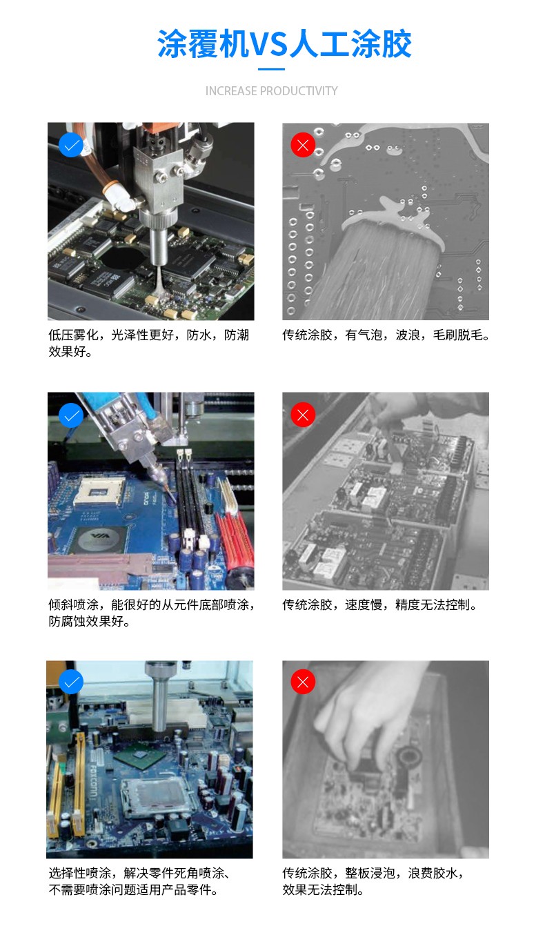 高品質(zhì):每個(gè)產(chǎn)品上三防漆涂覆量和厚度一致,產(chǎn)品一致性高,三防品質(zhì)穩(wěn)定可靠。